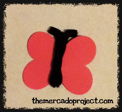 Step 3: To complete my little butterfly, I used a black pipe cleaner, formed the body, glued it in the middle of the two hearts and viola, a beautiful paper butterfly.
