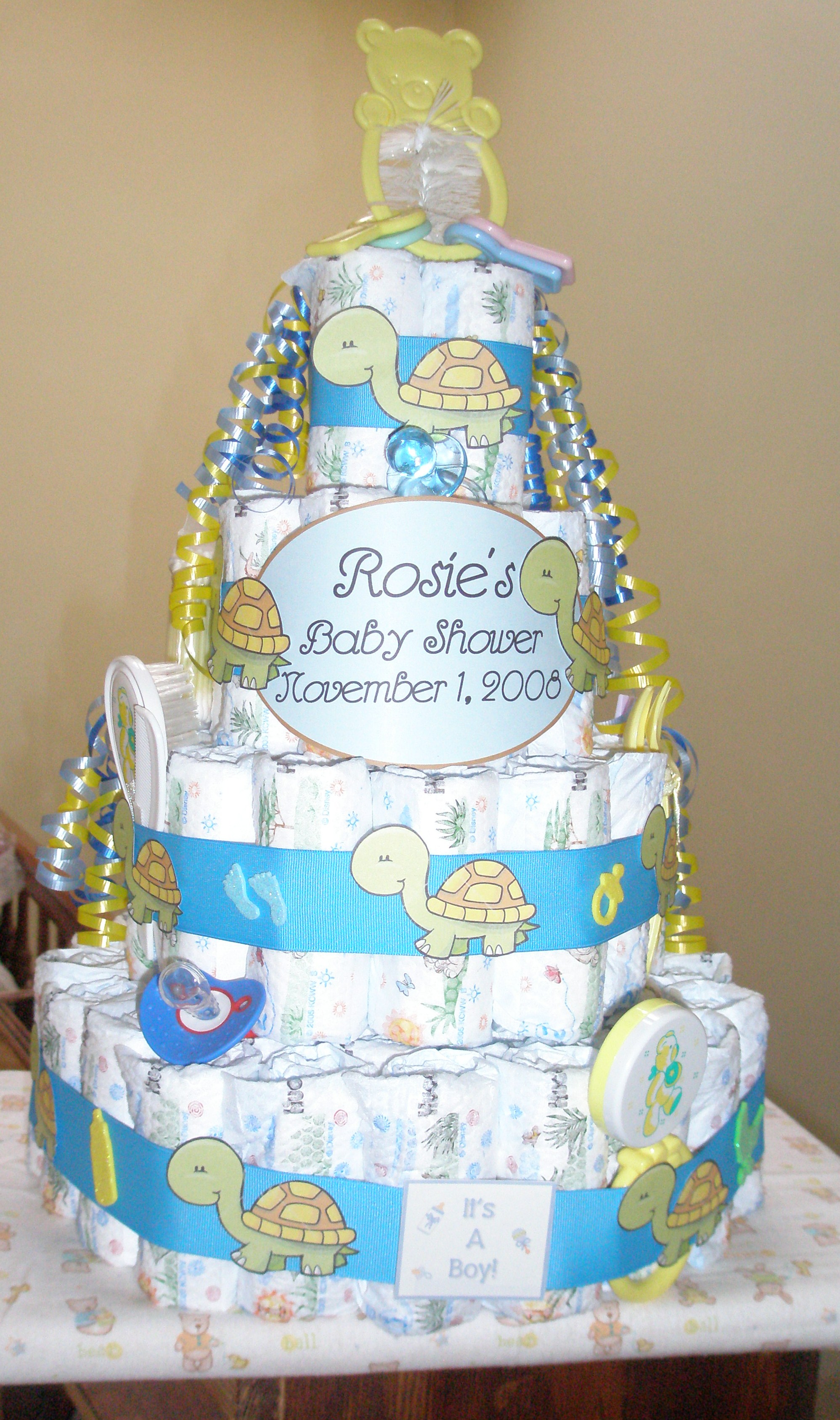 This was the first diaper cake I made.  My family and my cousin’s friends loved it.  It looked great on the table and it was one of a kind.  This cake made everyone happy, especially the expectant parents, because diapers are one of the most important gifts one can give.