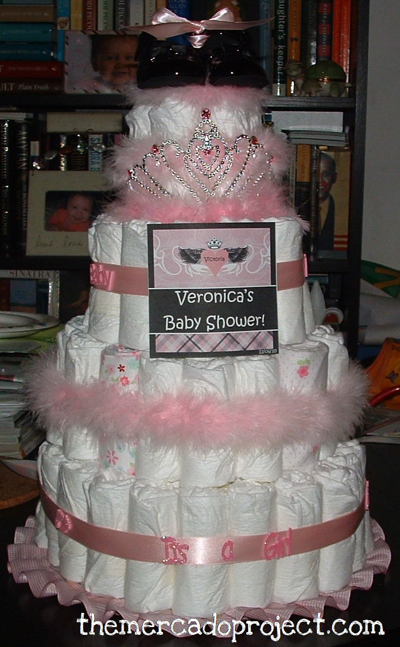 my Rock and Roll Princess diaper cake, which I made for my sister-in-law’s second child.  I placed a pair of brand new black, patent Mary Janes on top as the cake topper.  For decorations, I used a princess crown, pink feather boas, and on the base I glued gingham ribbon to make the skirt for the cake to sit on.  A hit once again!!