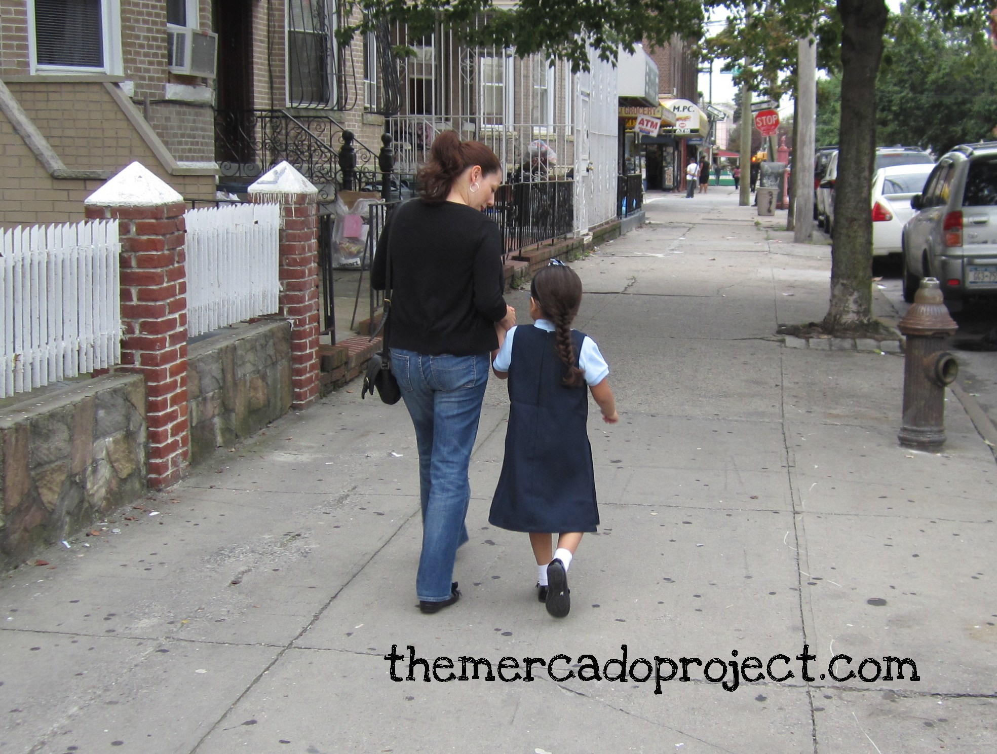 My daughter woke up excited.  I made her breakfast, one of her favorites: chocolate chip pancakes with a side of sliced apples.  We put her uniform on, took pictures, and started our walk to school.  She, understandably, became heavy footed as we got closer to school.  I told her everything was going to be ok.  We were met with chaos, of course, at the entrance of the school’s cafeteria, but we were able to enter and find her class and teacher.  Then I looked at my daughter’s face and it was covered in pure sadness.  I hugged and kissed her.  I did my very best to put on a brave face, but honestly we were both on the verge of tears.  I reassured her that things were going to be ok, that she was a brave little girl, and that I was going to be there to pick her up, always.  I left her with the teacher and the other kids, looked at her one more time and mouthed “It’s ok,” turned around and left the building.  As soon as I saw my husband, who was outside with our two-year old daughter, I started to BAWL.  He hugged me and we walked home discussing how difficult, but necessary this new journey was, for all of us.  Good luck and may you learn a lot my sweet, little but brave girl.