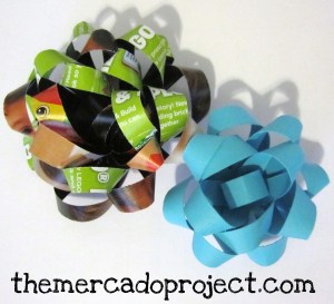 I used a magazine page, turquoise cardstock, and the instructions from the pin above to make these pretty bows.  I have to admit that I was so giddy after I made them.  I know I’m a dork, but a very happy one.  🙂  So go ahead and follow these instructions (thank you very much to whoever made them) and make a gift bow yourself.  It’ll put a smile on your face and keep your hard-earned money in your wallet (every penny counts).  You’ll be showing some talent, making a gift pretty, and recycling.  A win, win situation.  Happy bow making!