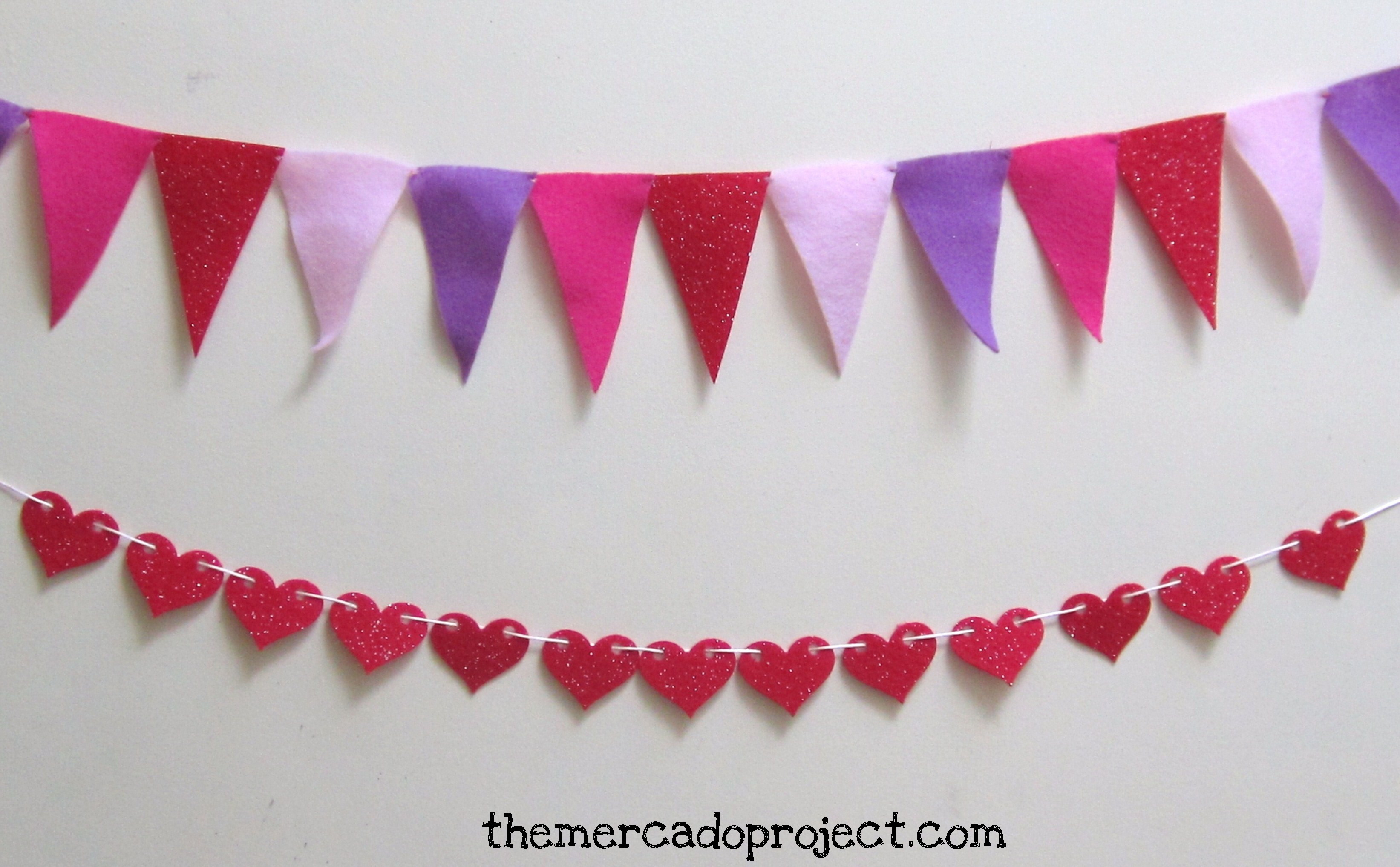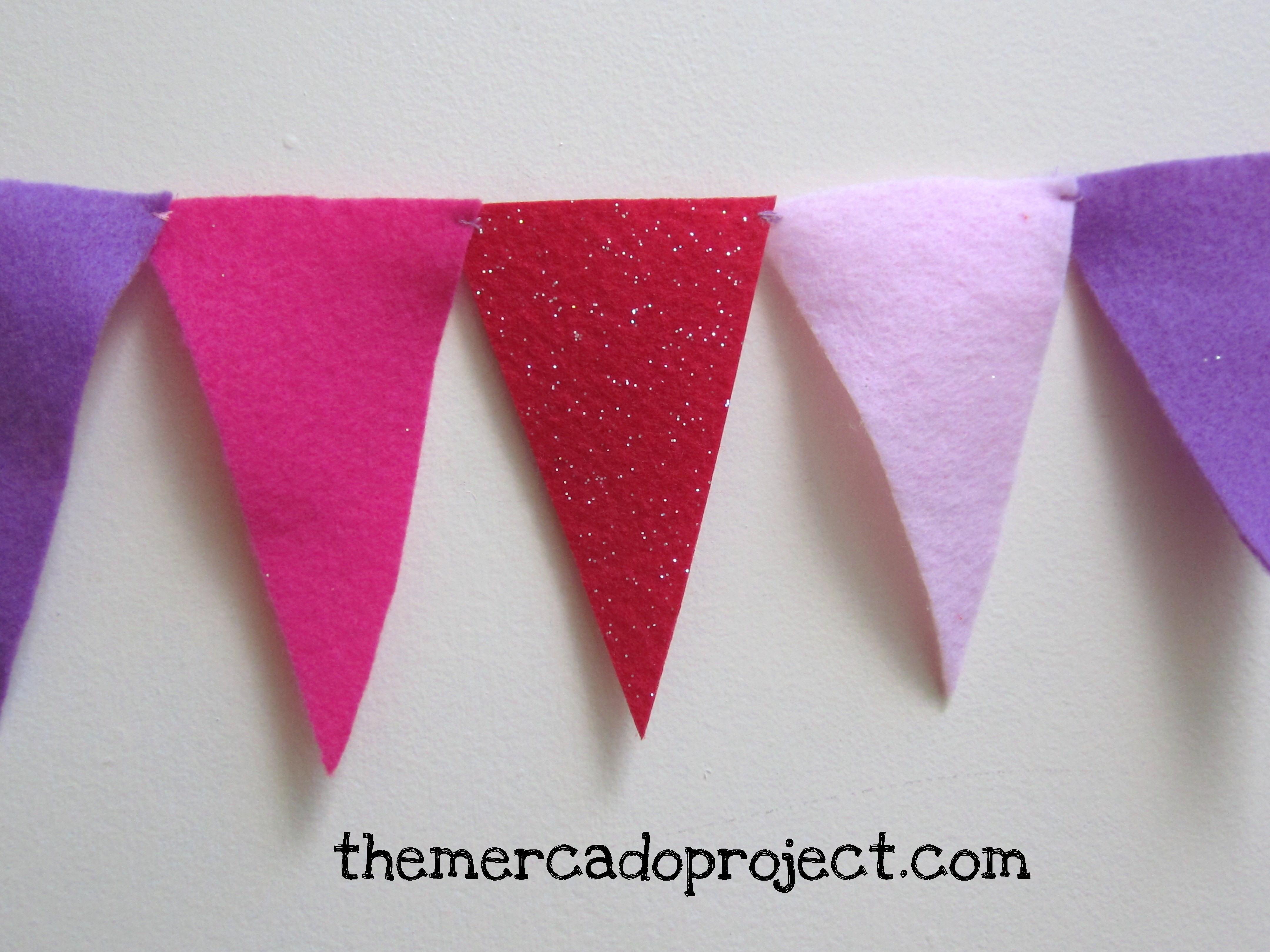I cut out the triangles (freehand) and then sewed them together right at the corner. For the heart banner, the glitter red felt was a bit thicker and I was able to punch out hearts and string them together.
