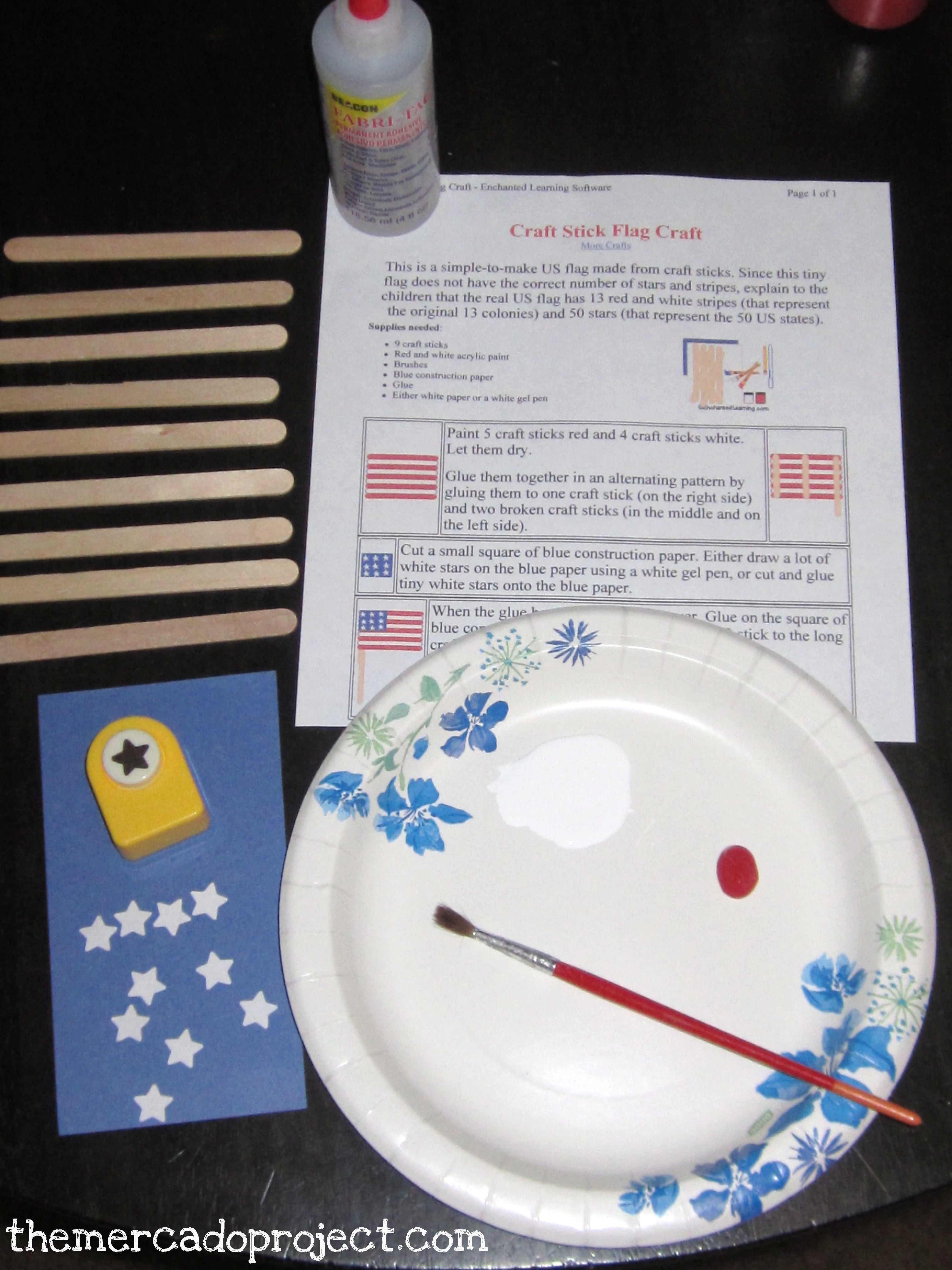 You will need the instructions (http://www.enchantedlearning.com/crafts/july4/craftstickflag/), craft sticks, glue, blue paper, white stars (I used a small star puncher that I have), paintbrush, and red and white acrylic paints.