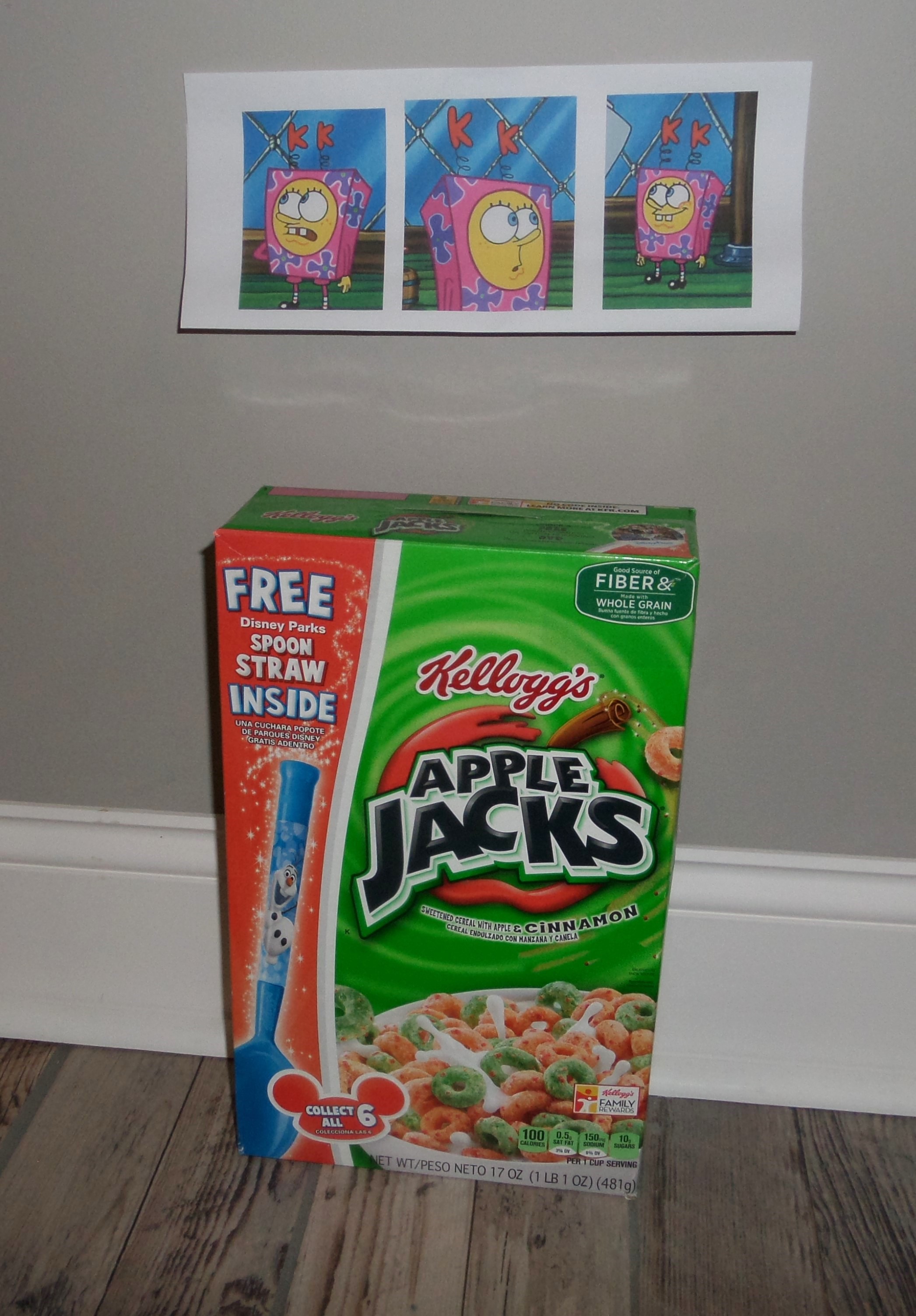 The materials we used were a cereal box, construction paper (pink, yellow, purple, white, and neon green card stock paper), and pipe cleaners. We also printed out a small spatula and a “Krabby Patty,” which we taped onto his hands.