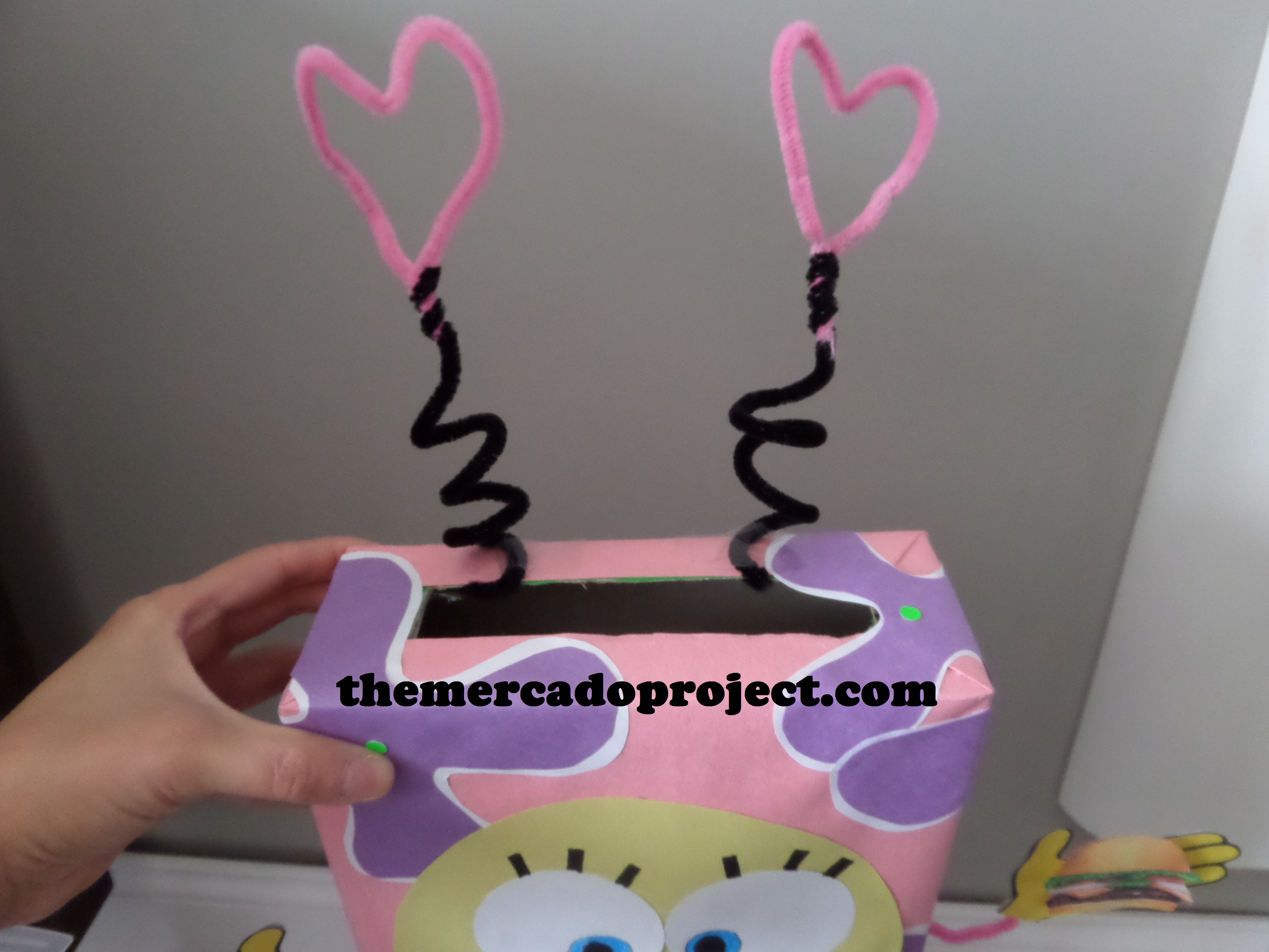 Here’s the breakdown: We gift wrapped the box with pink construction paper using tape and glue. My daughter traced a big circle out of yellow construction paper for his face and two small circles for his eyes with white paper as well as two little squares for his front teeth. She then drew the details herself. She used the template for the purple flower designs and we glued those down as well as his face. The pipe cleaners were used to make the antennas, arms, legs, socks, and shoes. She wanted to place two pink hearts on the antennas instead of the red K’s. For his yellow hands I copy and pasted a picture of SpongeBob and cropped the pic until his hands were the only things on the screen, then printed and glued onto the pipe cleaner. We did the image two sided so it was easier to glue. A slot at the top of the box ensures that valentine cards and treats will go in nicely!