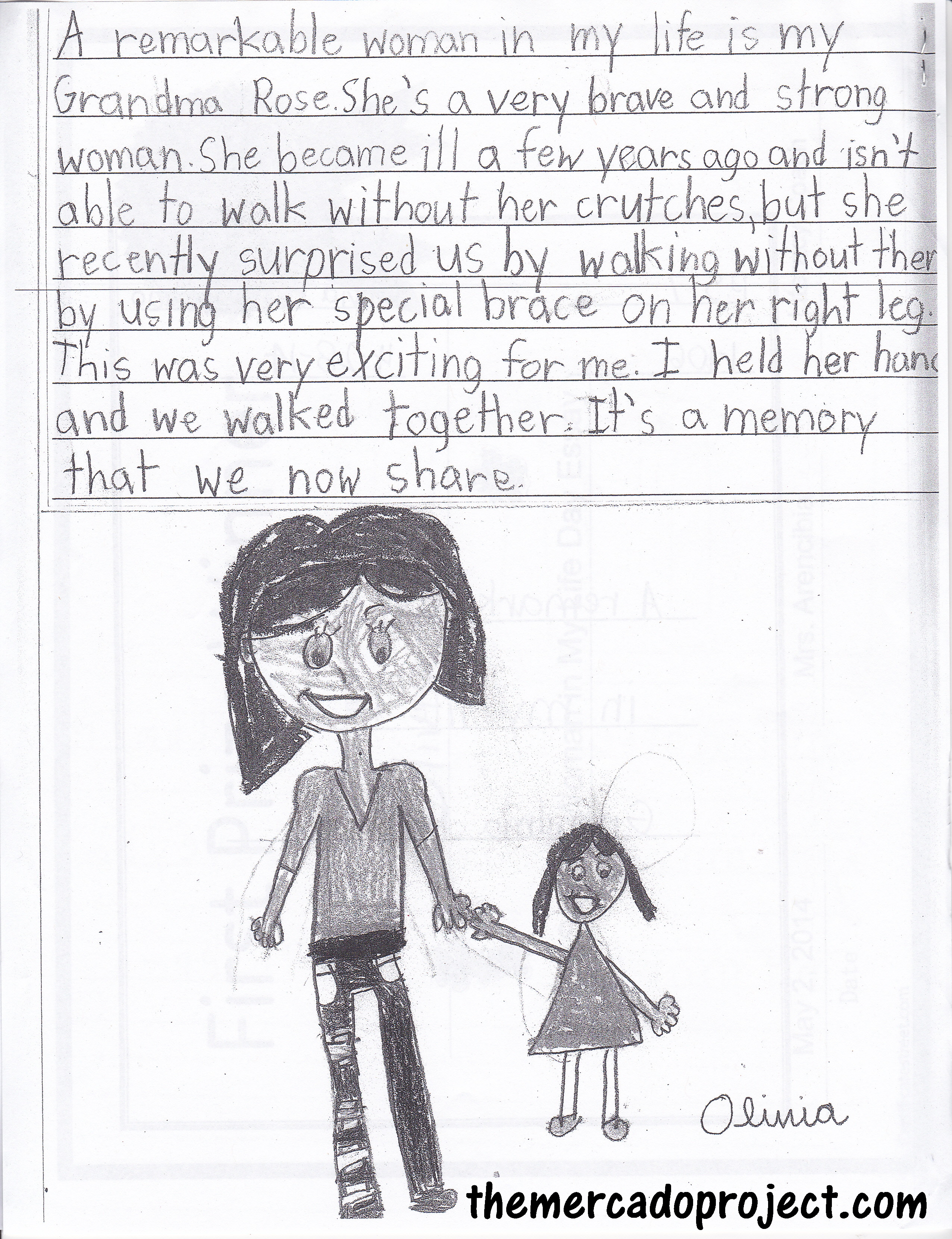 The essay read: A remarkable woman in my life is my Grandma Rose. She’s a very brave and strong woman. She became ill a few years ago and isn’t able to walk without her crutches, but she recently surprised us by walking without them by using her special brace on her right leg. This was very exciting for me. I held her hand and we walked together. It’s a memory that we now share.