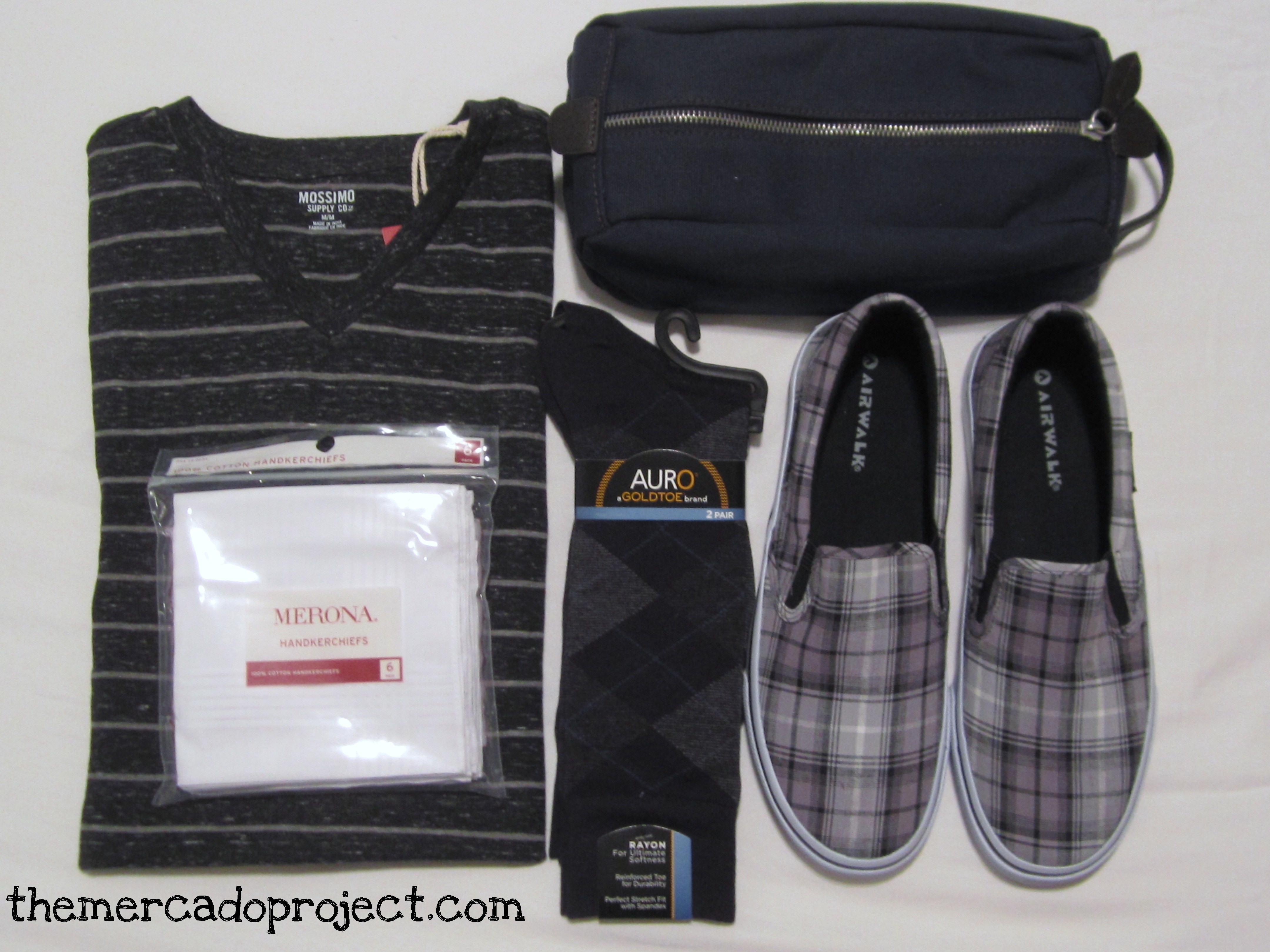Target: Mossimo Supply Co. short sleeve v-neck striped shirt, Merona 6 pack 100% cotton handkerchiefs (my dad carries a handkerchief with him every single day, he’s so wonderfully old school), 2 pair Auro Goldtoe socks, and a Merona Navy Canvas Dopp bag.