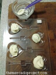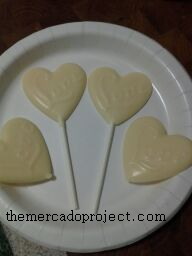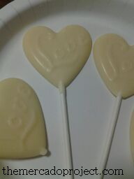 From my collection, I chose a heart-shaped lollipop mold with the word Love scripted in the middle, vanilla chocolate candy wafers, and a small bowl to melt the chocolate in.