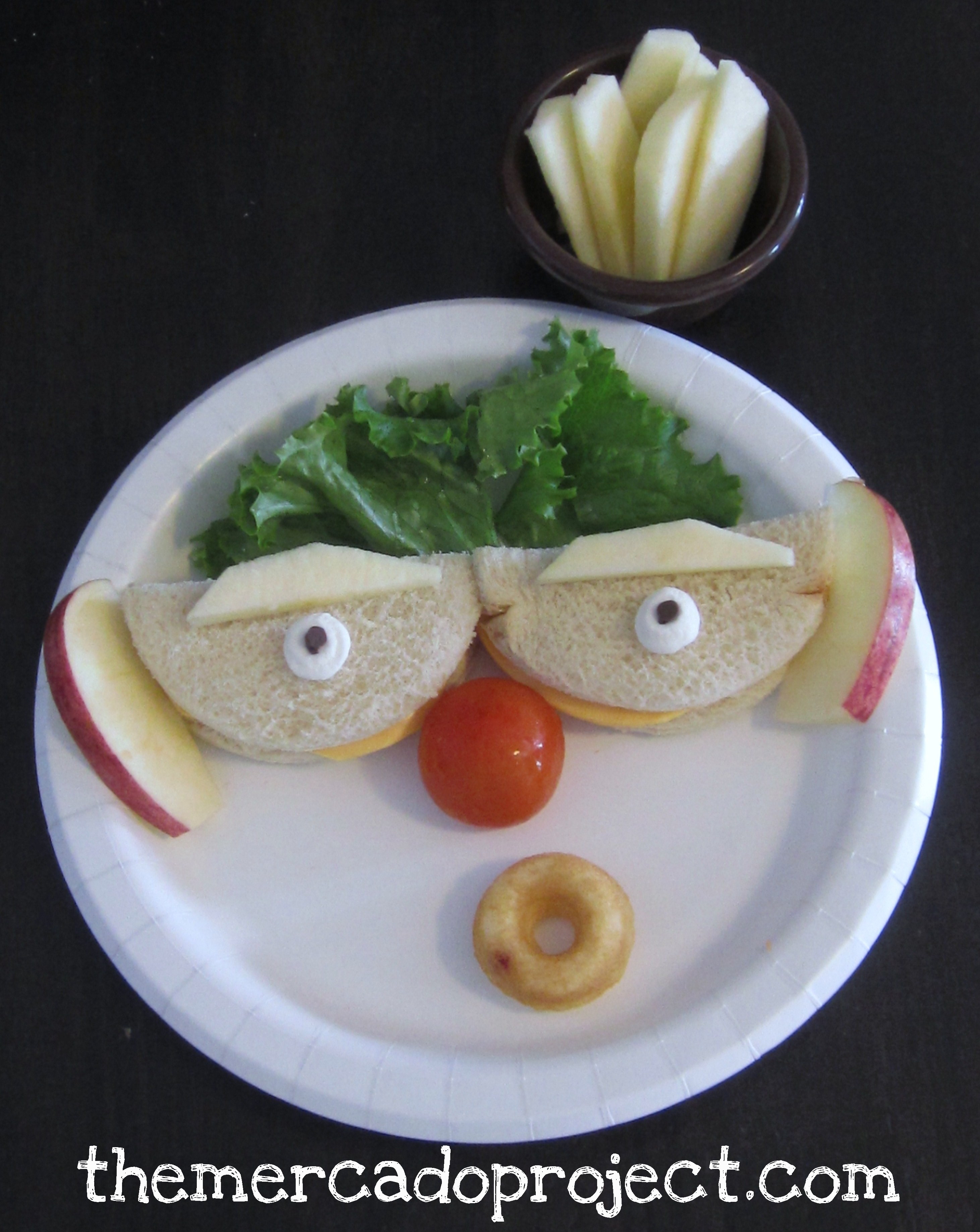 I made this funny face lunch for my oldest daughter today. It consisted of a mini raspberry muffin/doughnut, two mayo and cheese sandwiches, apple slices (in a bowl to look like a hat), mini marshmallows, mini chocolate chips, a big cherry tomato, and green salad. I wasn’t able to make another one for my youngest because she was resting due to a fever. 😦 Once she woke up I gave her liquids, Cheerios, and apple slices.
