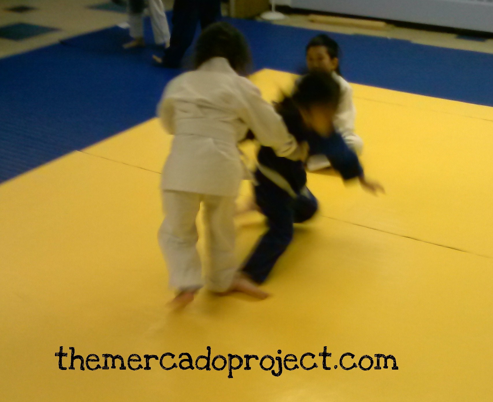 Olivia (in the white gi) maneuvering a way to take down her opponent/friend!